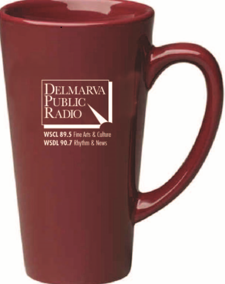 Show off your support for DPR with our coffee mug! This 14 oz. tall maroon ceramic mug is ideal for those long over-coffee conversations about topics and music you have heard on Delmarva Public Radio.